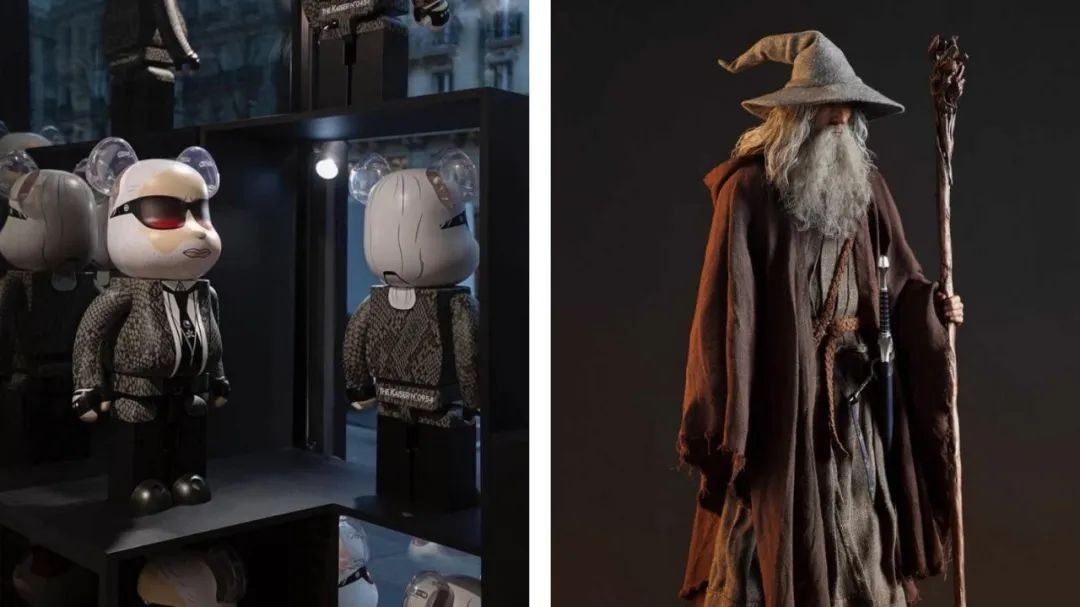 左(潮玩):BE@RBRICK《THE KAISER》1000%,高约70cm;右(手办):Queen Studios《甘道夫(灰袍)1/6收藏可动人偶》,真实布料、金属、PVC、ABS、羊毛、印刷品,高约30cm