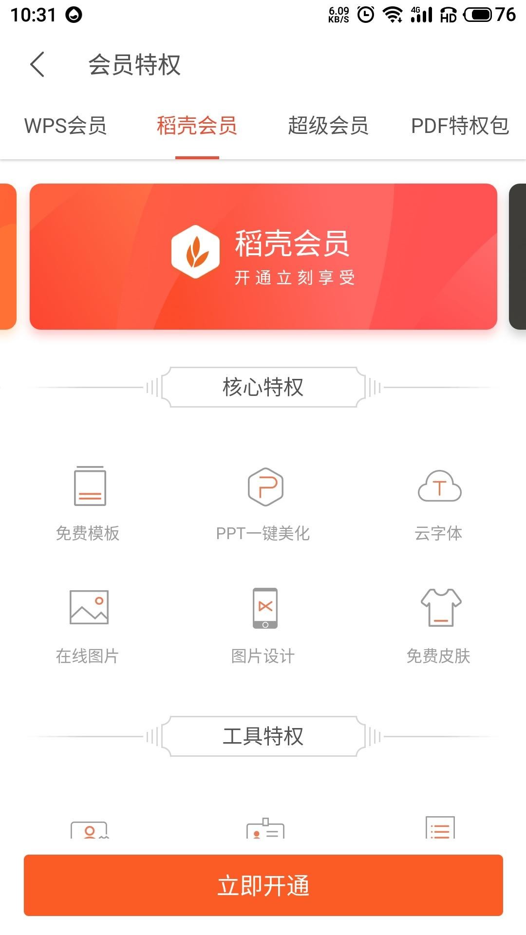 第二种是稻壳会员,它主要的特权有免费模板,PPT一键美化,云字体,在线图片,图片设计,免费皮肤等,大家同样可以自由选择。