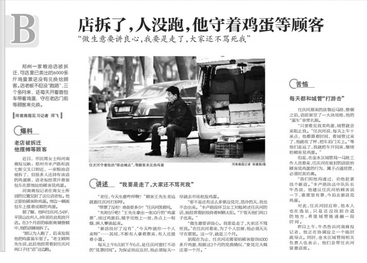 早在12年前,《河南商报》以《店拆了,人没跑,他守着鸡蛋等顾客》为题,对任庆河诚信兑鸡蛋的事迹率先进行了报道,引起了中央和地方媒体的密集关注。任庆河也因诚信赢得了2013年央视3·15贡献奖、“感动中原”十大人物奖等殊荣。如今闭店还乡,任庆河续写诚信故事,又一次感动了全国网友,把河南人重诺守信的美名传扬,为我们河南争了光。
