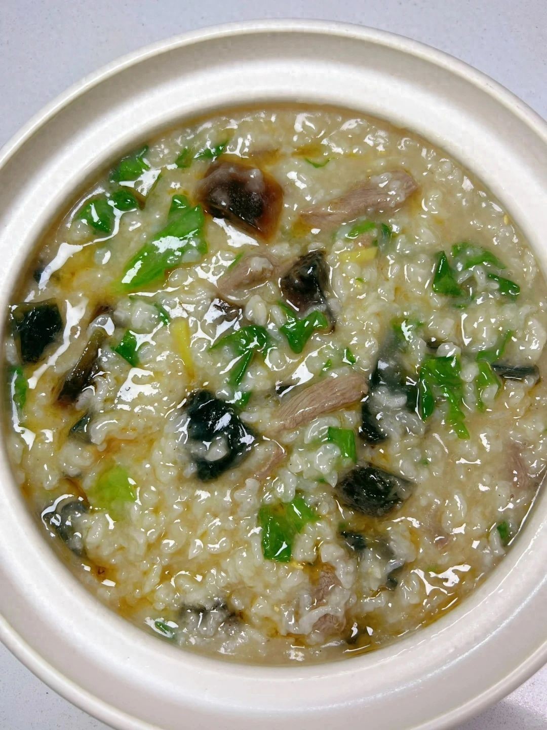 将泡了2小时的大米倒入烧开的水中,煮30分钟。期间记得隔一会搅动一下,防止粘锅。然后加入切好的皮蛋和腌制好的瘦肉丝,再煮5分钟。最后,放入盐、胡椒粉、花生酱和香油调味,关火后烫一些生菜,一碗香浓Q弹的皮蛋粥就大功告成了!