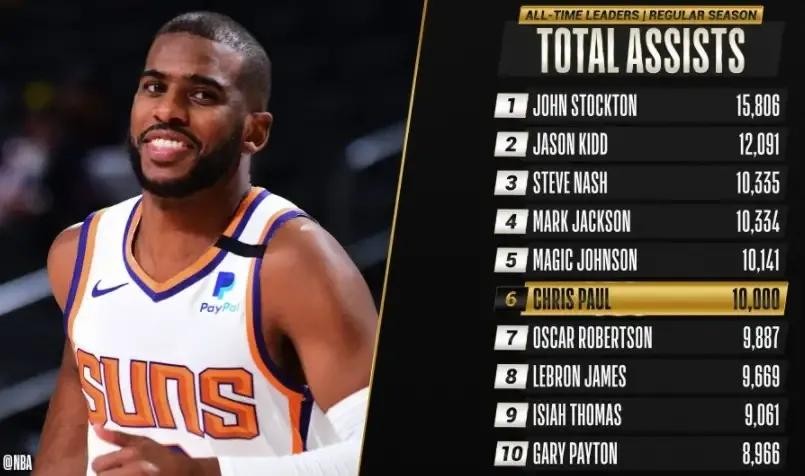 在NBA历史助攻榜上,保罗身前的球员分别是斯托克顿(15806次)、基德(12091次)、纳什(10335次)、马克·杰克逊(10334次)和“魔术师”约翰逊(10141次),无一例外都是NBA历史传奇后卫。而保罗拿下10000助攻的出场次数仅次于魔术师约翰逊和斯托克顿。而保罗也将有望成为历史第一个20000分10000助攻5000篮板的大神,所以把保罗放在NBA历史级别的控卫之列一点都不为过!