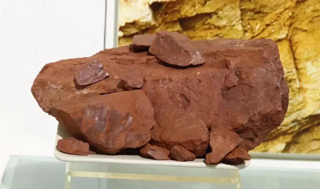 紫砂红泥,属泥质粉砂岩,外观为红、黄色调的致密块状结构,质地一般比较均匀,含有少量的白色云母碎片,易酥开但不溶于水。