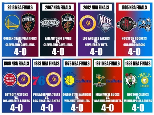勇士是唯一一支两度在总决赛中横扫对手的球队,湖人是唯一一支三次被横扫的球队,也是唯一一支在总决赛横扫过对手,也被对手横扫过的球队。湖人80年代9次打进总决赛,拿到5个总冠军,但同时也被横扫两次。奇才和骑士均被横扫两次。