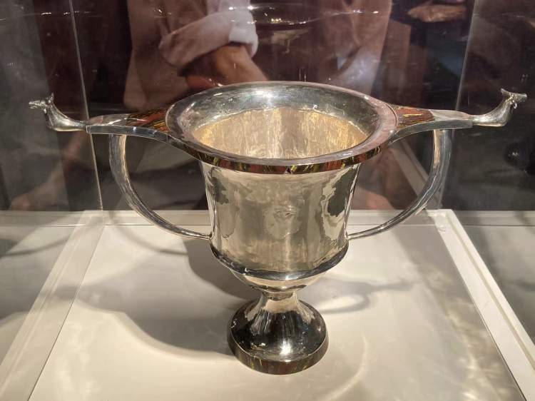 展品中,《带着微笑的康塔罗斯酒杯》尤为引人注目,这件手工锻造的希腊式银杯,呈现出一种神秘的美。作品出自法国当代著名金匠古吉之手,古吉曾被法国文化部授予“艺术大师”称号,他的作品被众多知名博物馆收藏,并成为法国总统向外国元首赠送的国礼。