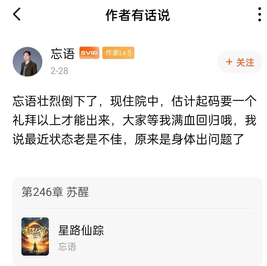 重点来了,忘语在2025年2月27号后,就没有更新作品了,原因忘语本人也透露了,身体抱恙已住院。