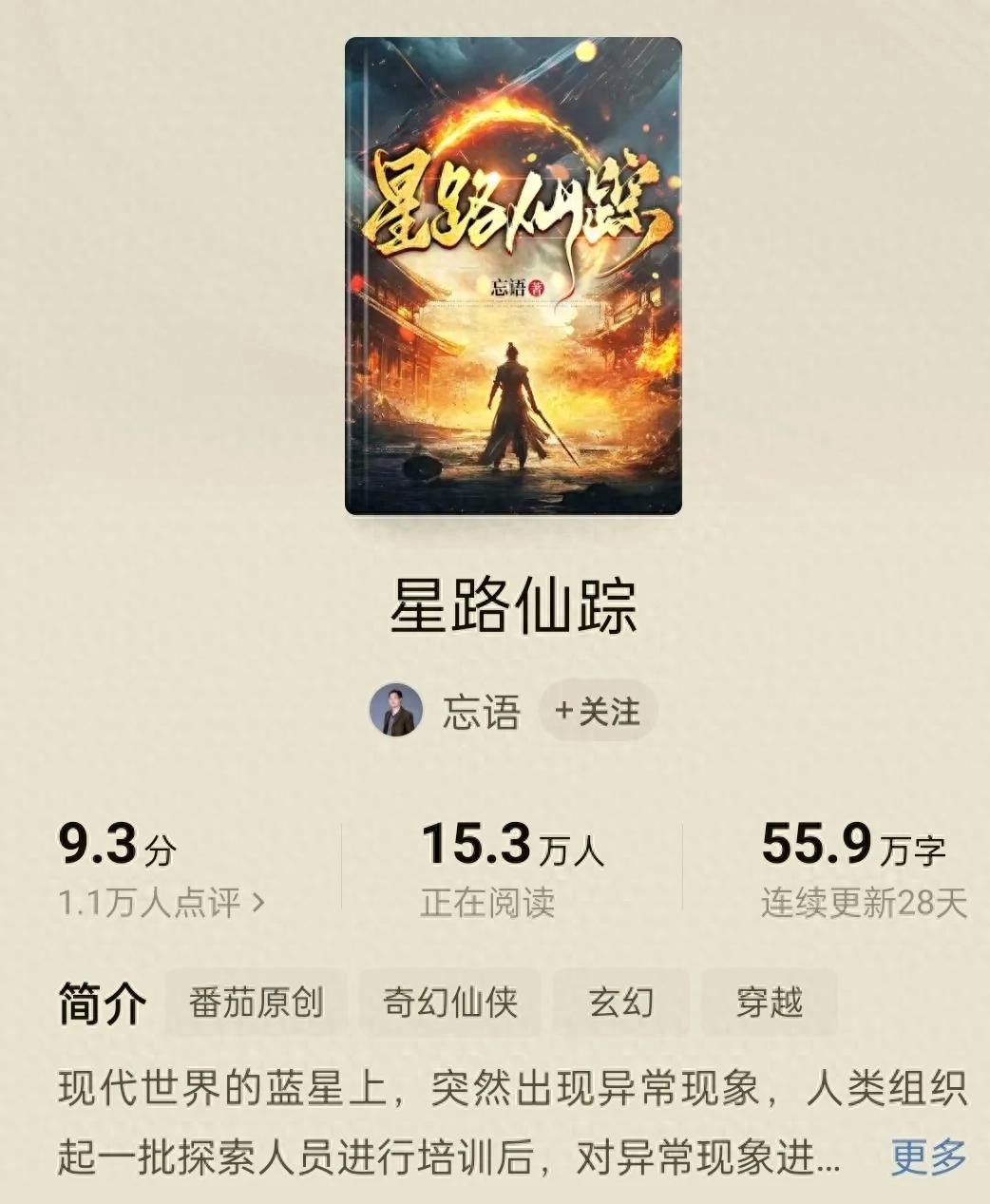 去年2024年10月14日,忘语发文表示,自己已经入驻“番茄小说”,次日15号于番茄小说平台,发布首部小说《星路仙踪》。