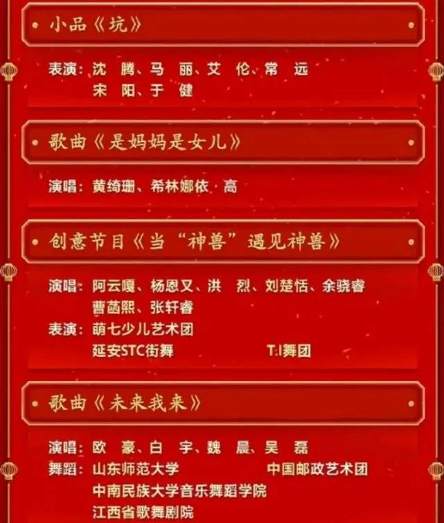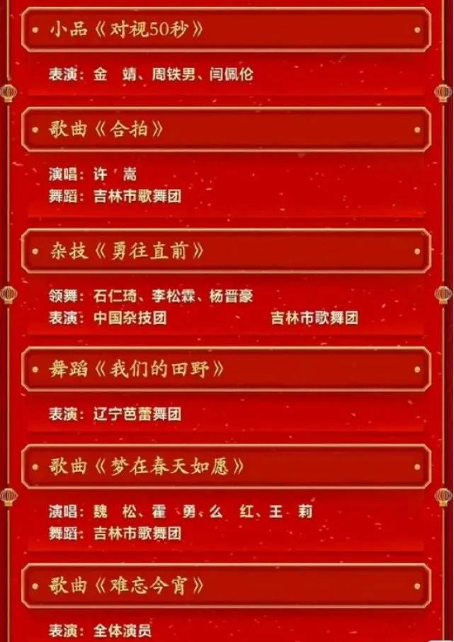 整个节目单看下来,内容还是挺丰富的。就是感觉语言类节目有点少,老一代的小品演员已经全部退出历史舞台。对于这个节目单,你有什么想说的吗?你最期待的是哪个节目?