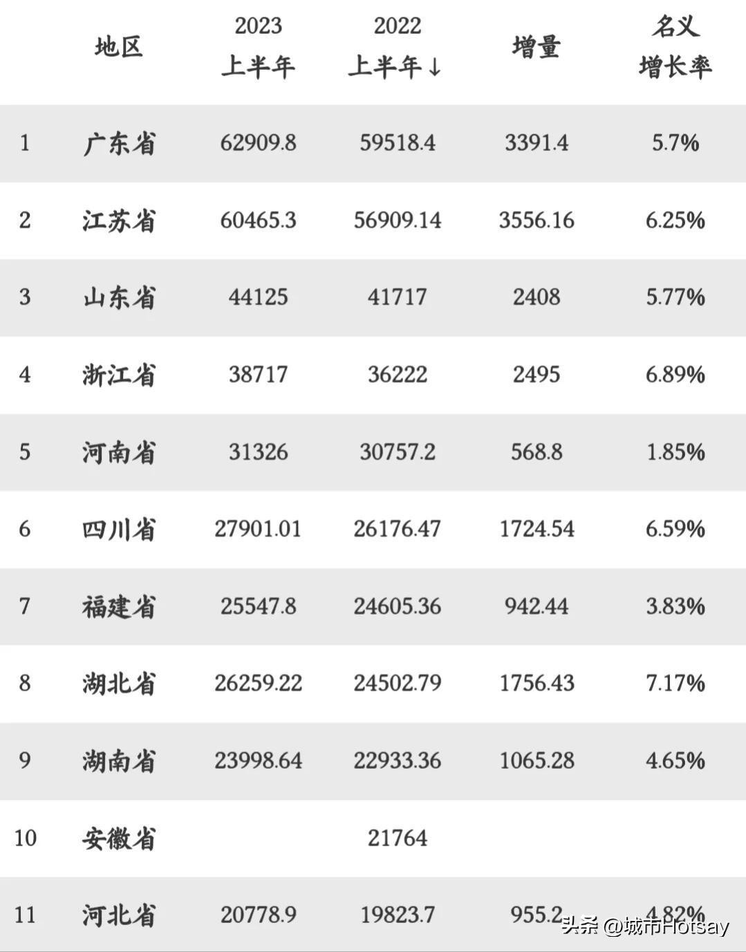 省份发展趋势一直都备受大家的关注,随着2023上半年的GDP数据陆续出炉,我们基本已经可以确定全国10强省份,其实,从“站位”来看,基本与以往的排名相差无几,所以它们最新的排名依次为广东、江苏、山东、浙江、河南、四川、湖北、福建、湖南、安徽。其中,苏浙进入前四,江苏GDP约为60465.3亿元,而浙江则为38717亿元,四川省以27901.01亿,远超了福建的25547.8亿元。需要注意的是,安徽省还是比较抢眼的,毕竟,安徽也是近些年新晋全国前十的新秀。可是目前仅有安徽省的数据虽然暂未出炉,但是,想必安徽省入围前十强应该并不难,实际上,也有人预测安徽省上半年度的GDP可达23000多亿元。
