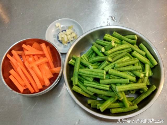 1先将红萝卜切成条状,豆角切段(大约5cm左右),蒜切末