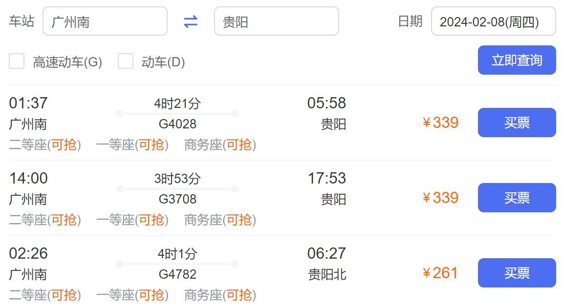 查询了一下现在贵广高铁从广州南站到贵阳站的高铁费用,二等座车票价格是261元而已,大众票大概是339元,其实都不算贵,大概4个小时左右车程,贵广高铁全程大概857公里,站点有21个,经过提速升级后,目前的列车运营速度300公里/小时。