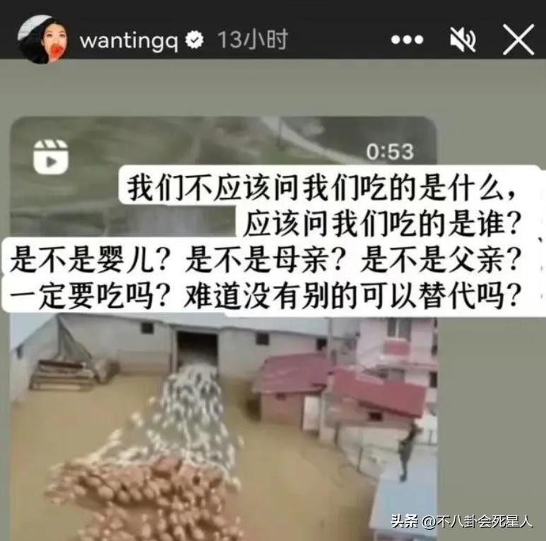 除此之外,她之前屡次发表吃素言论,发出灵魂质问说“一定要吃肉吗?难道没有别的可以替代?”