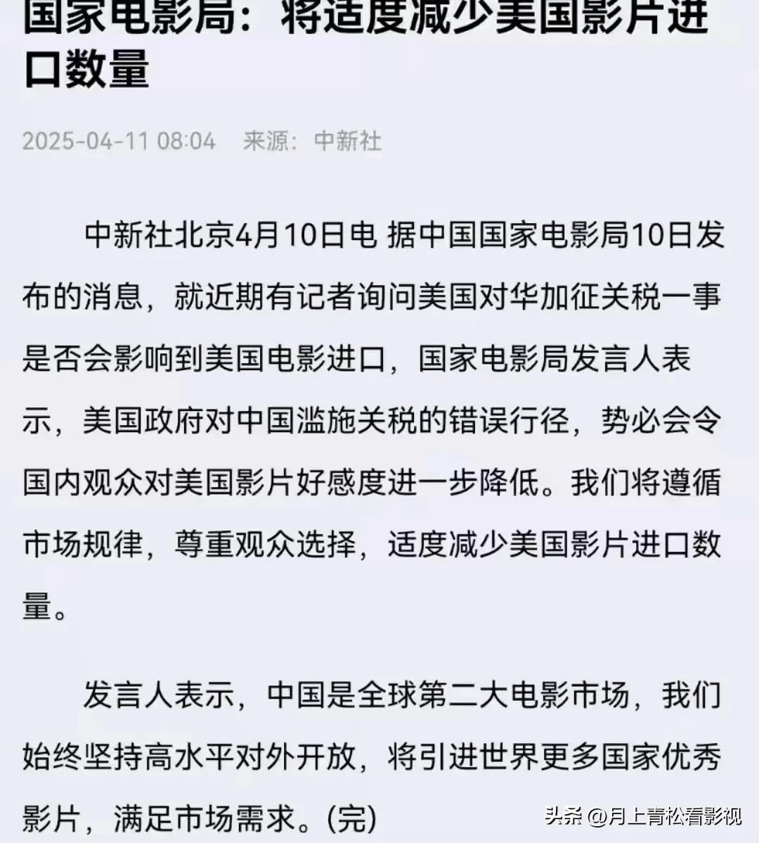 现在国际国内最热的事就是中美关税战,其中,2025年4月10日,国家电影局发言人针对美国对华加征关税问题作出重磅表态:美国政府对中国滥施关税的错误行径,势必会令国内观众对美国影片好感度进一步降低,我们将依据市场规律调整进口策略,适度减少美国影片进口数量。