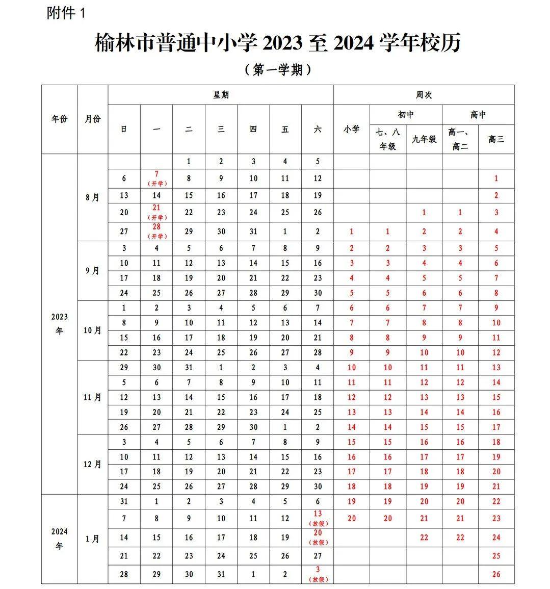 高中(普通高中、中等职业学校):高一、高二年级于2023年8月21日开学上课,2024年1月20日放假,全学期共22周。高三年级于2023年8月7日开学上课,2024年2月3日放假,全学期共26周。