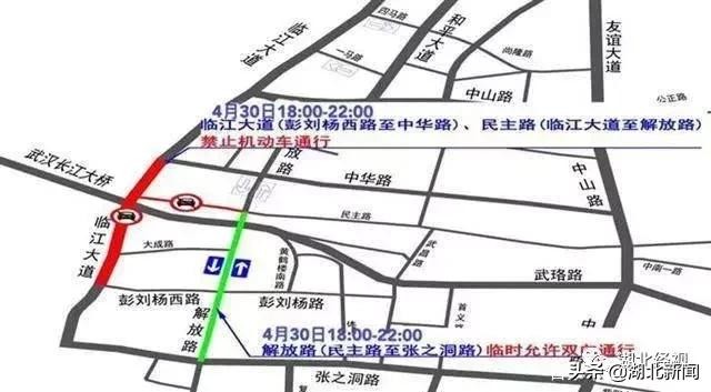 今晚6点到10点,临江大道(彭刘杨西路至中华路)、民主路(临江大道至解放路)禁止机动车通行和停放。解放路(民主路至张之洞路)临时允许双向通行。需通行上述路段的机动车,可经彭刘杨西路、张之洞路、解放路、中华路等相关道路绕行。