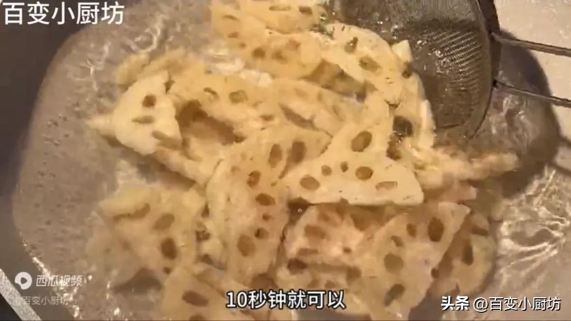 接着将藕片倒下去,焯水十秒钟,莲藕焯水的时候加一点白醋,可以让莲藕吃起来更加清脆可口,并且保持莲藕不变色,这也是为什么你炒出来的莲藕又发黑还发软发黏,而饭店里面炒出来的莲藕清脆爽口的关键所在。