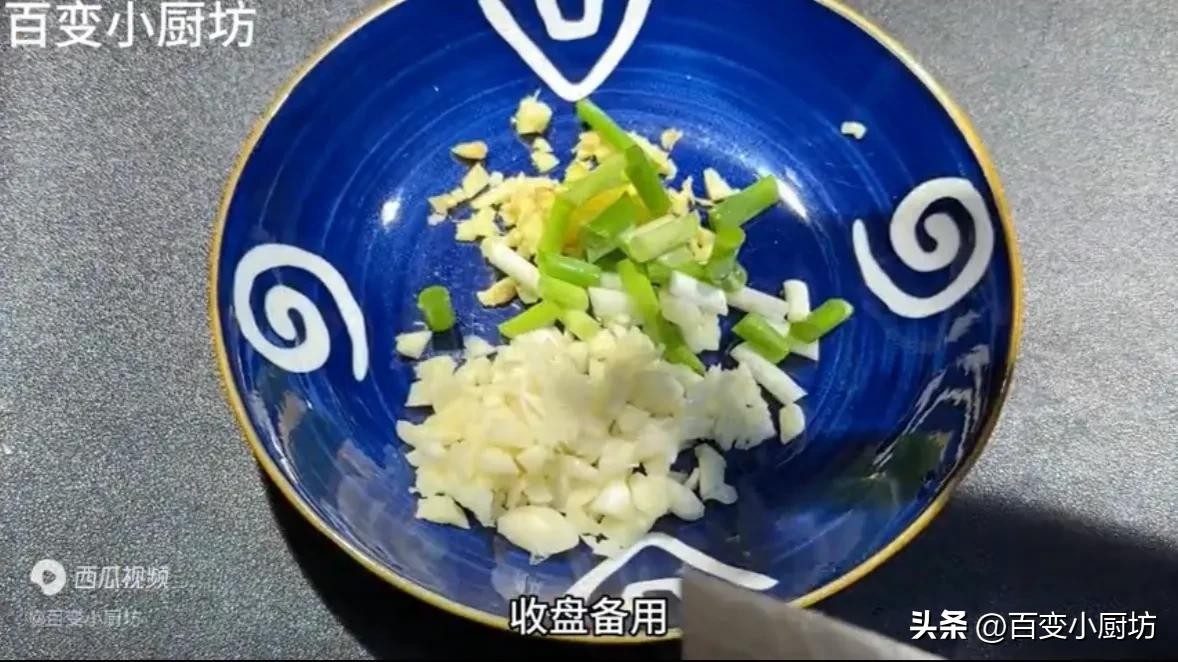 切好后收入盘中,接下来准备多一点的大蒜,先把它拍碎,然后再切成蒜末。