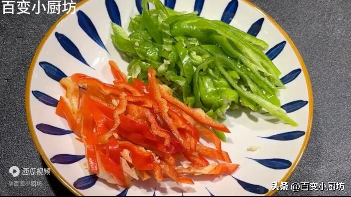接下来准备两个绿辣椒,切去辣椒蒂,从中间将辣椒剖开,去掉里面的辣椒籽,然后斜切成比较粗一点的辣椒丝,收入盘中备用。