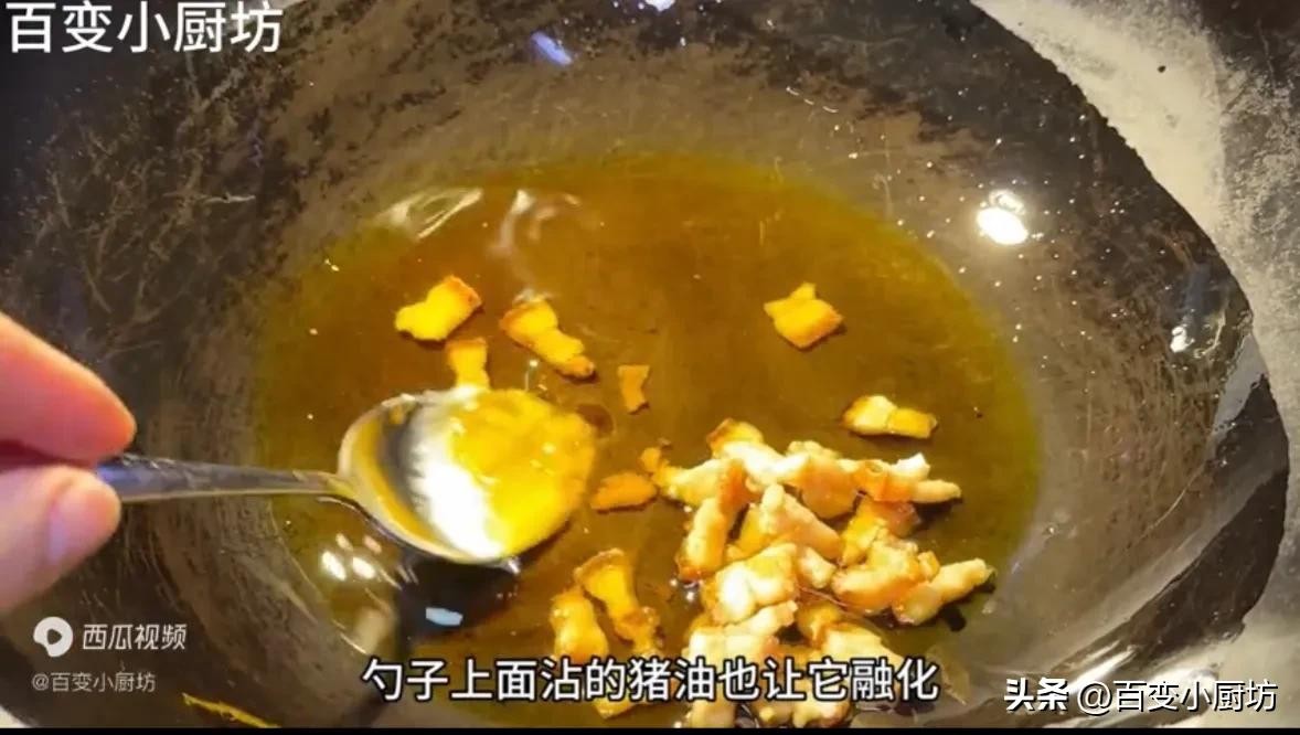再往里面加一点油渣。勺子上面沾的猪油也让它融化在锅里面,不要浪费掉了。