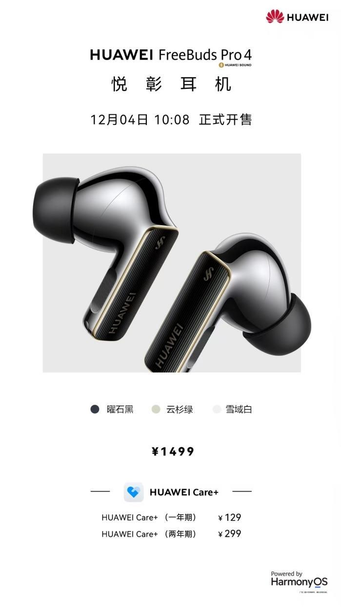 华为FreeBuds Pro 4定价1499元, 12月4日10:08全渠道正式开售,用户可登陆华为商城及各大授权电商平台,或前往华为体验店、华为授权零售门店进行选购。购买华为FreeBuds Pro 4 悦彰耳机,附赠权益卡在鸿蒙NEXT手机可免费兑换1个月超钻会员;叠加鸿蒙NEXT先锋权益,还可领取3个月华为音乐会员,同步可升超钻会员;累计可获4个月免费畅听权益,享受全曲库超高清和全曲库空间音频。