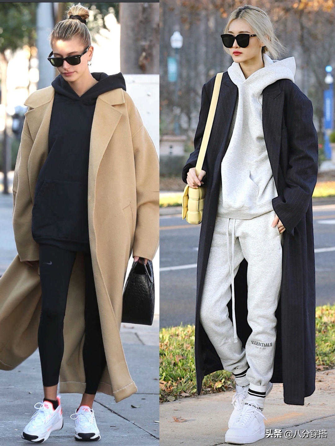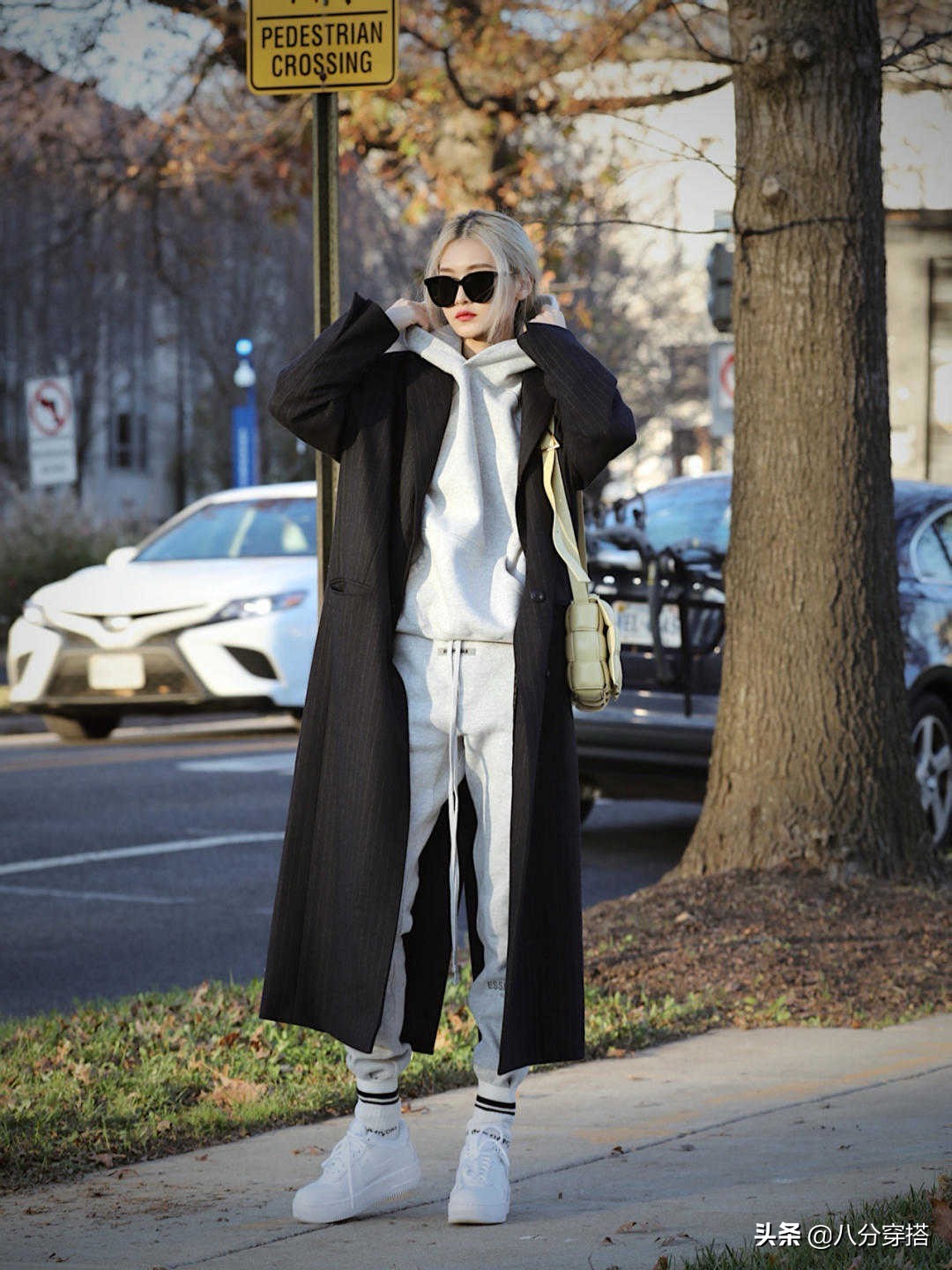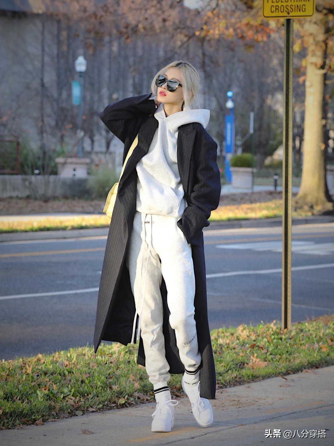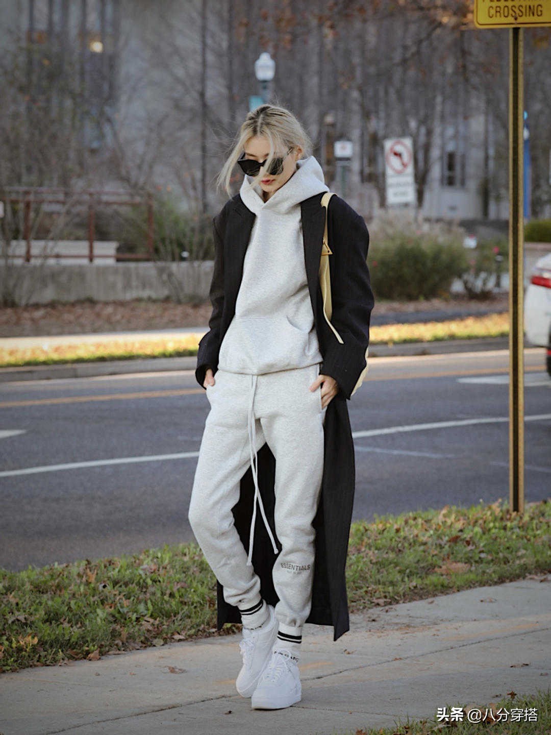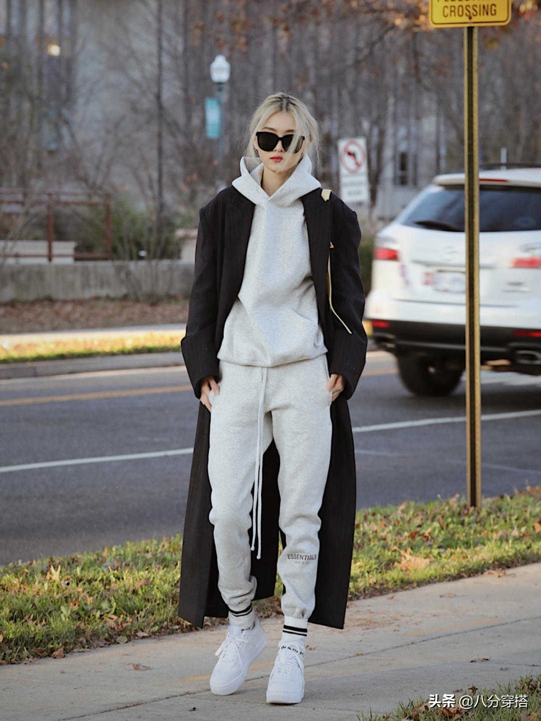 第一套:灰白色带帽卫衣搭配灰白色运动裤,外搭一件黑色大衣。