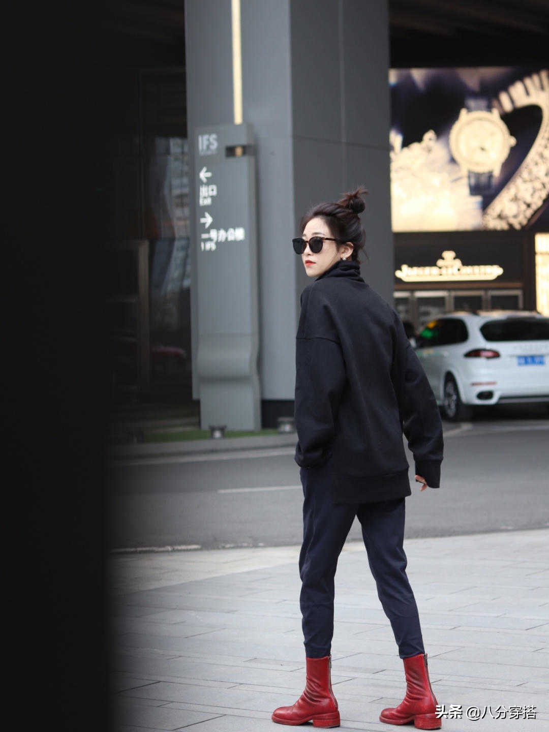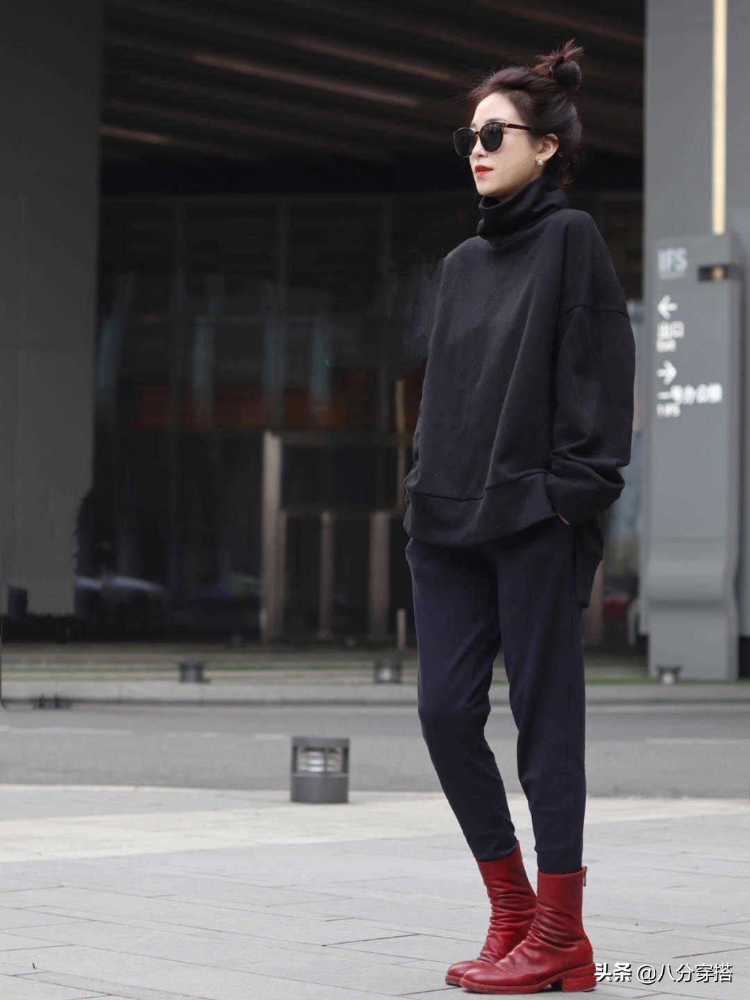 黑色的高领卫衣,相比较带帽卫衣,或者圆领卫衣,都略显成熟知性,而衣身的宽松感带来整套风格最佳的感觉,看上去成熟知性,只是略有一些单薄之感,但在天气比较好的时候穿还是很不错的选择。