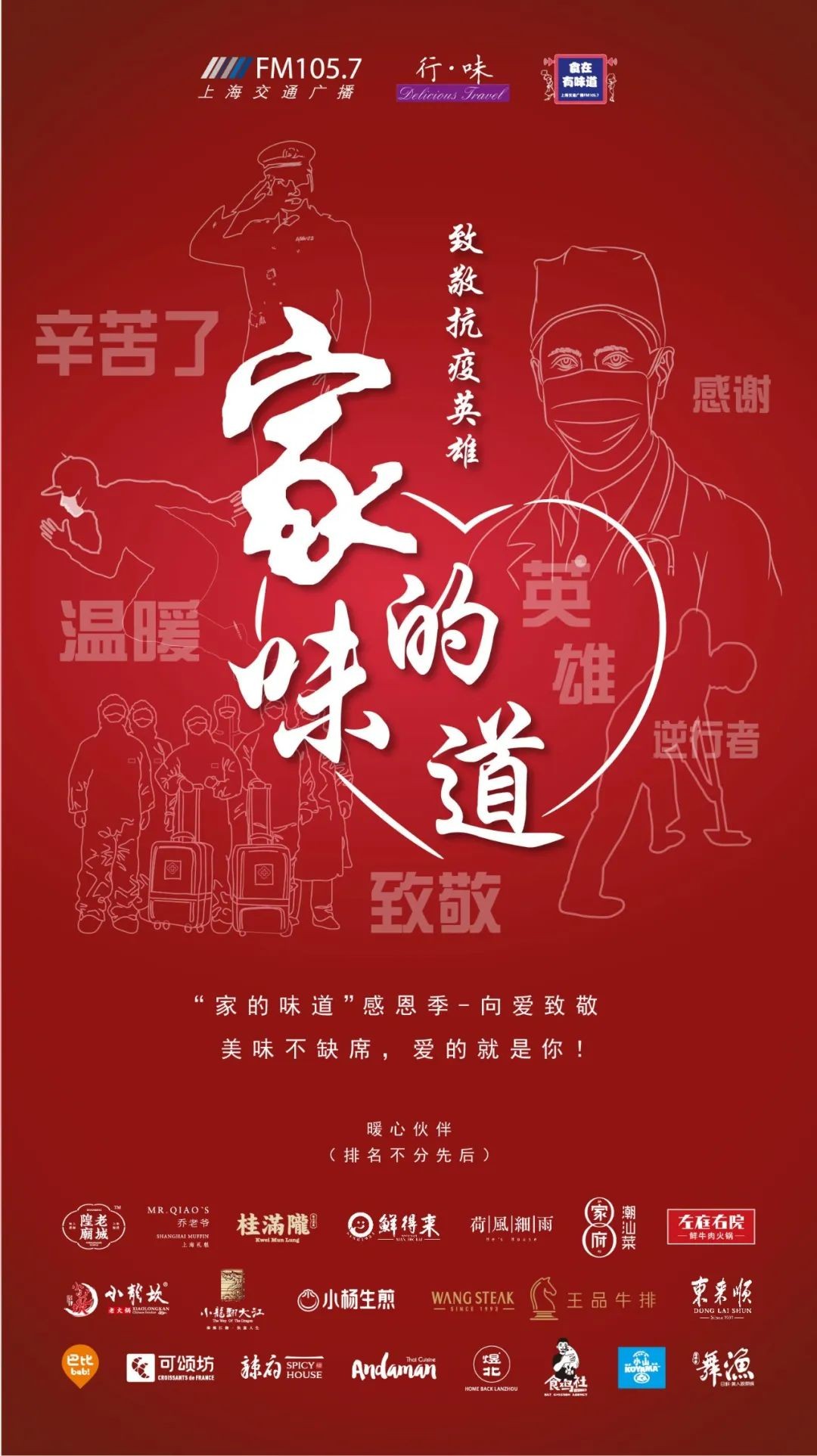 1057主播和听友走进不同的守护者身边,听他们的故事,说一声“谢谢”,送一份美味,传一份满满的爱……让爱“回家”,行·味牵手餐饮品牌,将城市美食味道装入红色暖心礼袋,用最淳朴的味觉打开每一个家团聚食客的温暖。