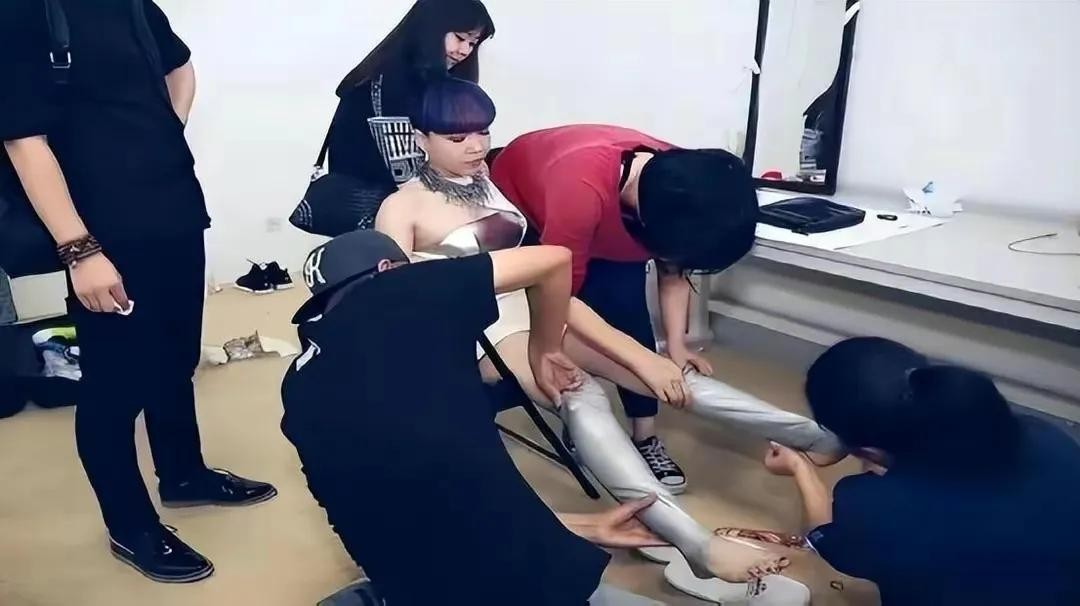 为了不影响正常的出场时间,于是吴莫愁身边的工作人员便一同帮她更换服装。