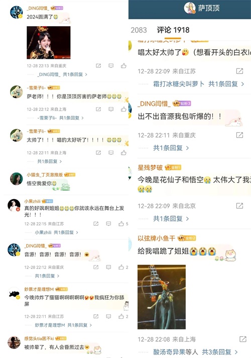 一曲《天命.启心程》更是气势恢宏,一开唱就引发无数观众尖叫不停!有网友热评听了萨顶顶的这首歌,“2024年圆满了”唱的太好了,太有气势了,被帅晕了,你是顶顶厉害的萨老师等等,好评不断,更有诸多网友索要这首歌的音源!