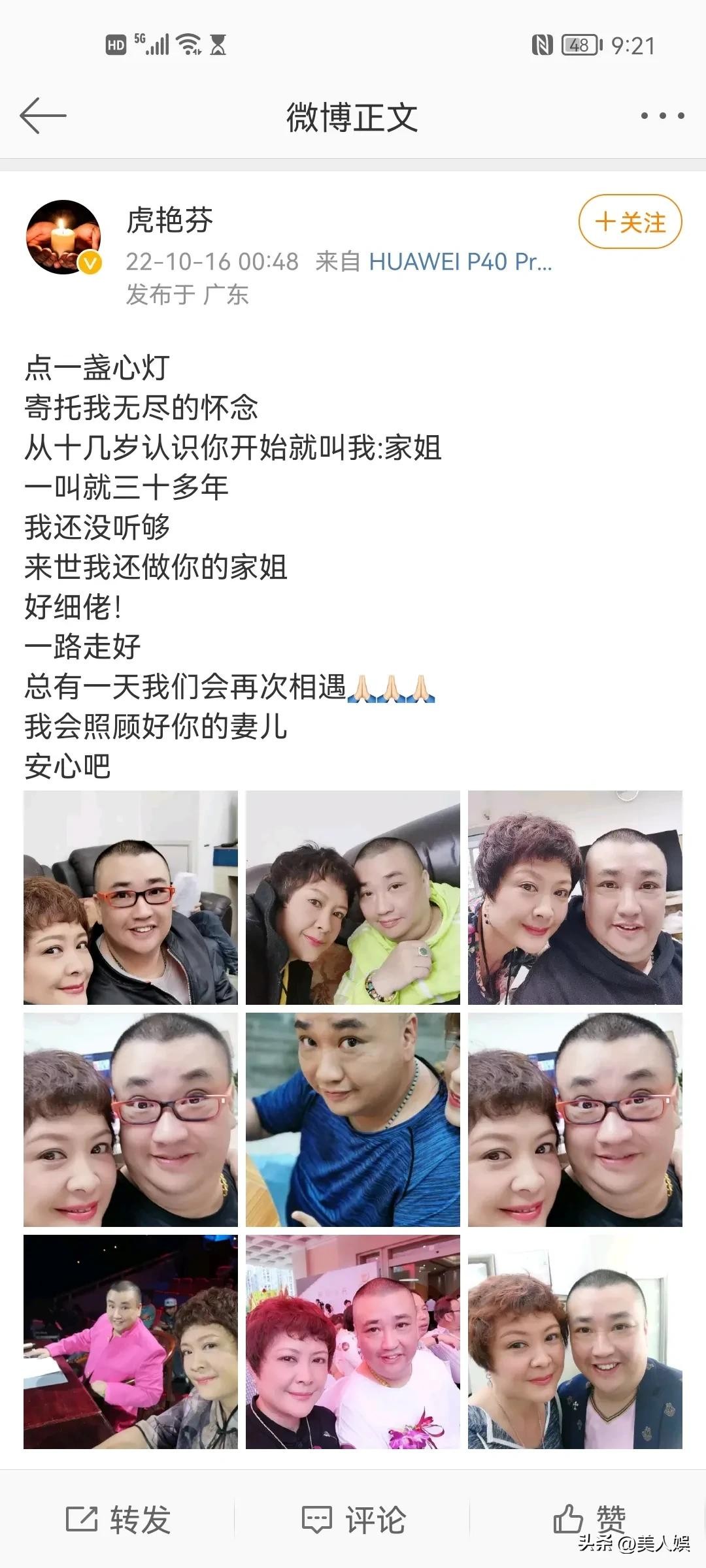 10月16日零时48分,虎艳芬又在网上发文写道:“点一盏心灯 寄托我无尽的怀念 从十几岁认识你开始就叫我:家姐, 一叫就三十多年 ,我还没听够 ,来世我还做你的家姐 好细佬! 一路走好 总有一天我们会再次相遇 我会照顾好你的妻儿 。安心吧 !”