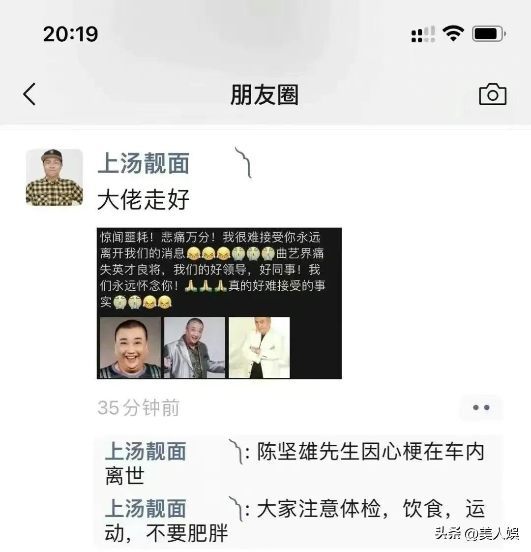得知此事,广东影视界人士及众多亲友齐叹可惜,许多人在朋友圈发文转发悼念陈坚雄,还有人透露他是因心肌梗塞病逝于车内,呼吁大家平时多注意身体、多注重饮食健康。