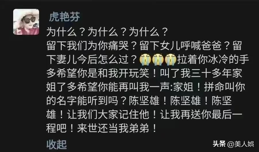 虎艳芬激动地发文写道:“为什么?留下我们为你痛哭?留下女儿呼喊爸爸,留下妻儿今后怎么过?叫了我三十多年姐姐,多希望你再叫我一声姐姐,希望来世还当我弟弟。”