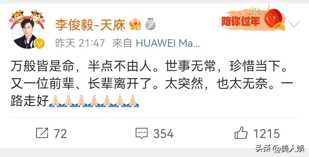康天庥李俊毅也发文悼念戏里的“舅舅”,他写道:“万般皆是命,半点不由人。世事无常,珍惜当下。又一位前辈、长辈离开了,太突然,也太无奈,一路走好。”