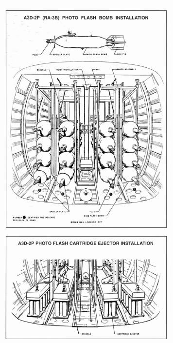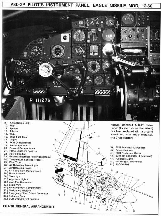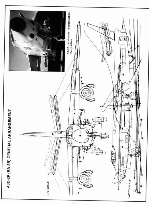 RA-3B/A3D-2P:摄影侦察机,配备侦查舱包,最多可容纳 12 台相机和闪光弹发射器。增加的压力仓范围允许摄像机操作员进入托架检查摄像机。一些保留了尾炮,但大多数后来被改装为晚期 A-3B 的 ECM 设备。