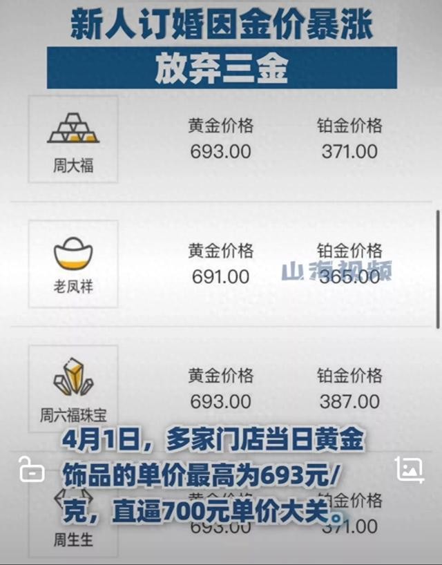 近日,一场突如其来的黄金风暴席卷了全国,让许多即将步入婚姻殿堂的新人措手不及。4月1日,黄金饰品价格冲破每克693元高位,直逼700元大关,引发了社会各界的广泛关注和热议。在这个特殊时期,原本准备为婚礼添彩的“三金”(金戒指、金项链、金手镯)成了许多新人心中的痛。