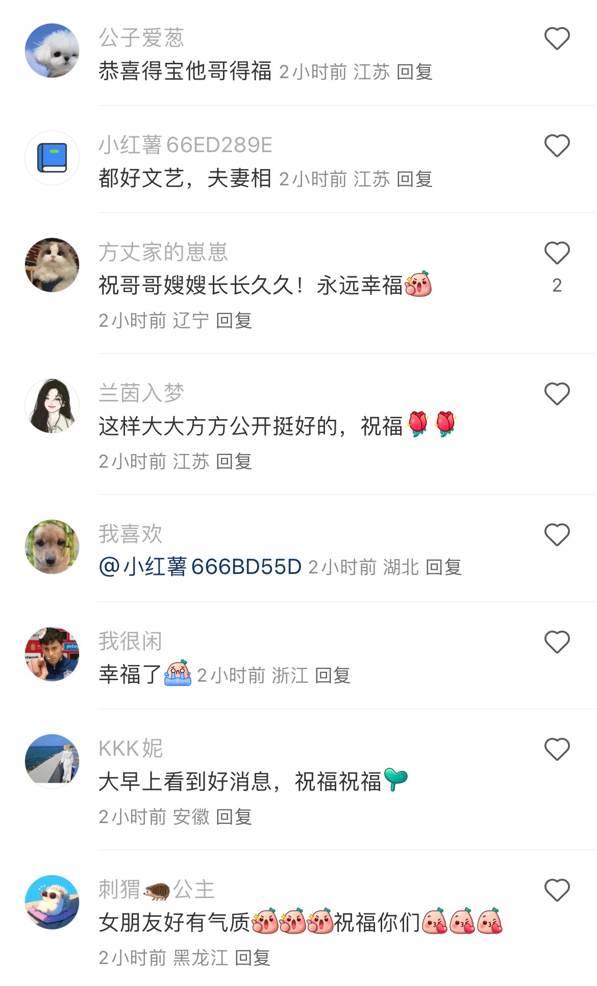消息一经公开,引众网友点赞祝福,有网友还表示二人很有夫妻相。截至发稿,该帖已获2.5万点赞。