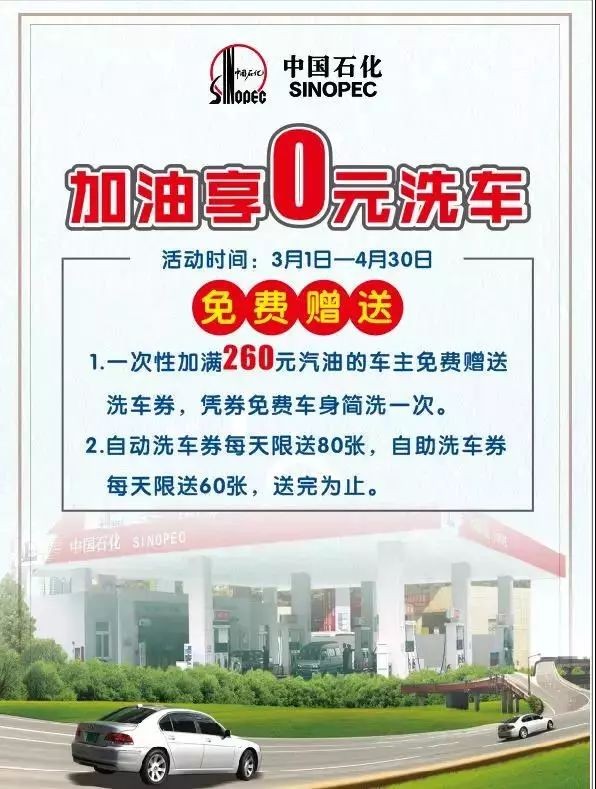 1.一次性加满260元汽油的车主免费赠送洗车券,凭券免费车身简洗一次。