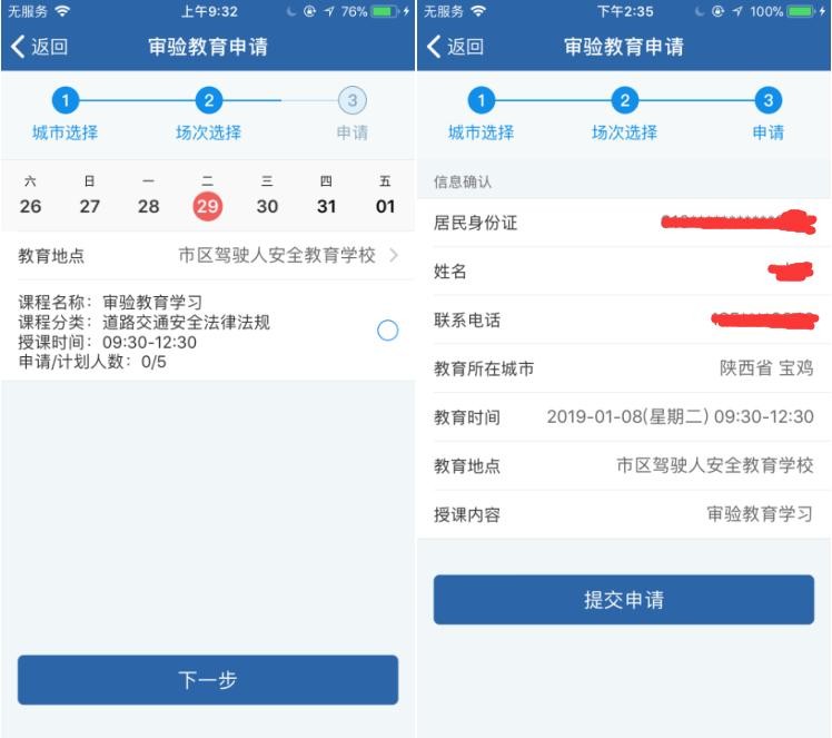 驾驶人需先完成现场教育城市选择,然后仔细阅读审验教育申请业务须知和申告信息后,才能进入学习场次选择页面。驾驶人完成教育地点、教育场次选择后,核实申请信息无误的,即可完成审验现场教育申请。