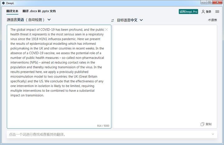 DeepL以其高质量的翻译服务和出色的语言处理能力而闻名,独特的翻译算法能够充分理解语言的上下文和语义信息,从而在翻译过程中保持原文的语义完整性和准确性,其翻译结果准确度高,专业名词的翻译也很到位,覆盖了全球范围内的主要语言,适合专业领域的文献翻译。