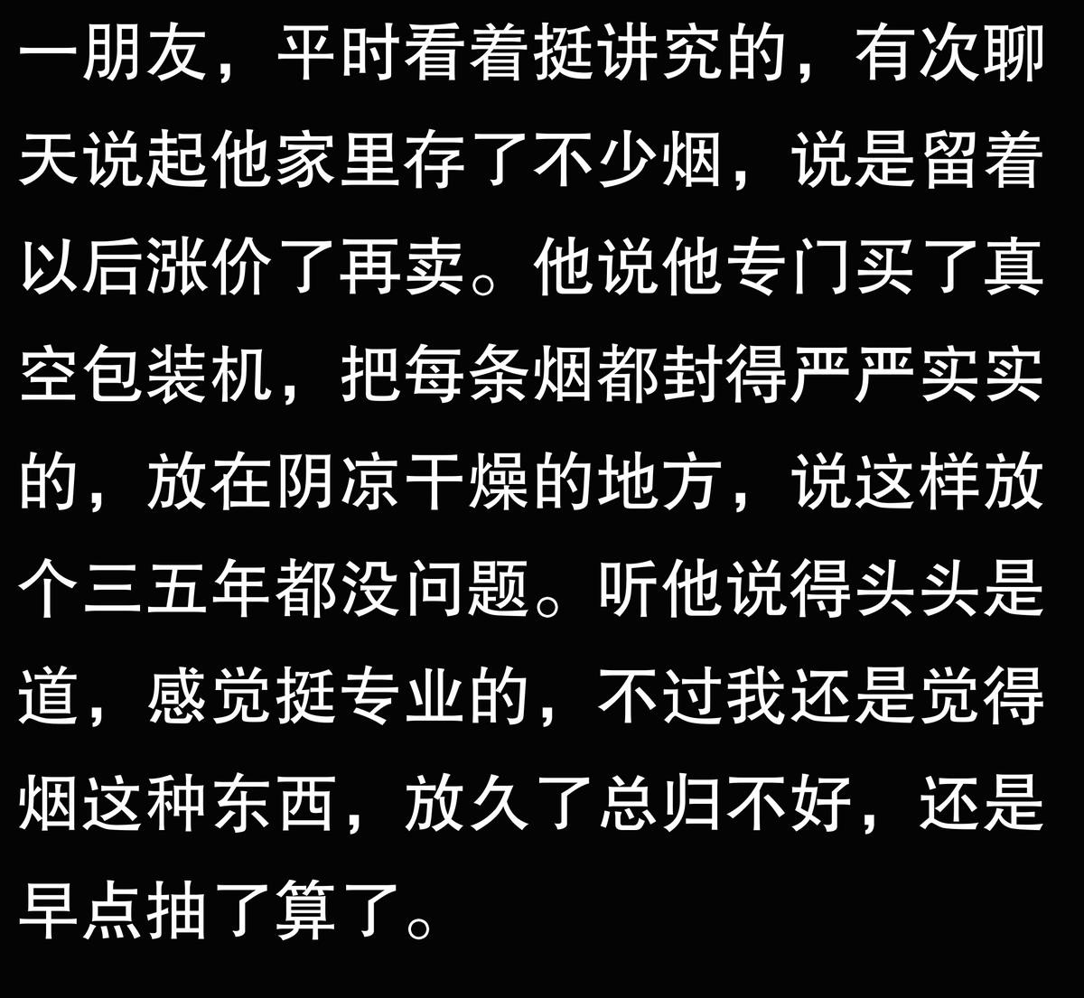 我家里有一条放了五年的烟,拆开抽了一根,味道跟新的一样。不过听说放久了会发霉,我这条倒是没发现,可能跟保存环境有关吧。反正我是不敢多放,怕抽了出问题。