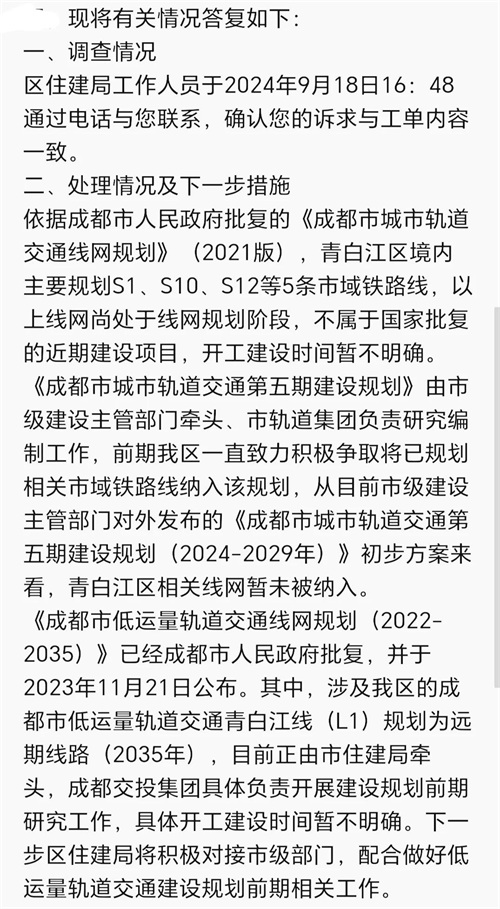 青白江至成都中心城区的地铁有没有最新消息,官方回复来了