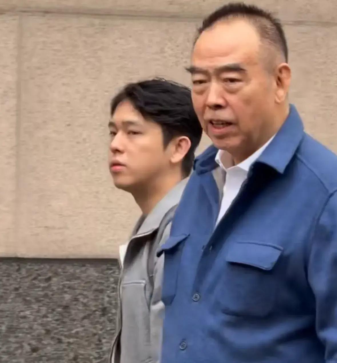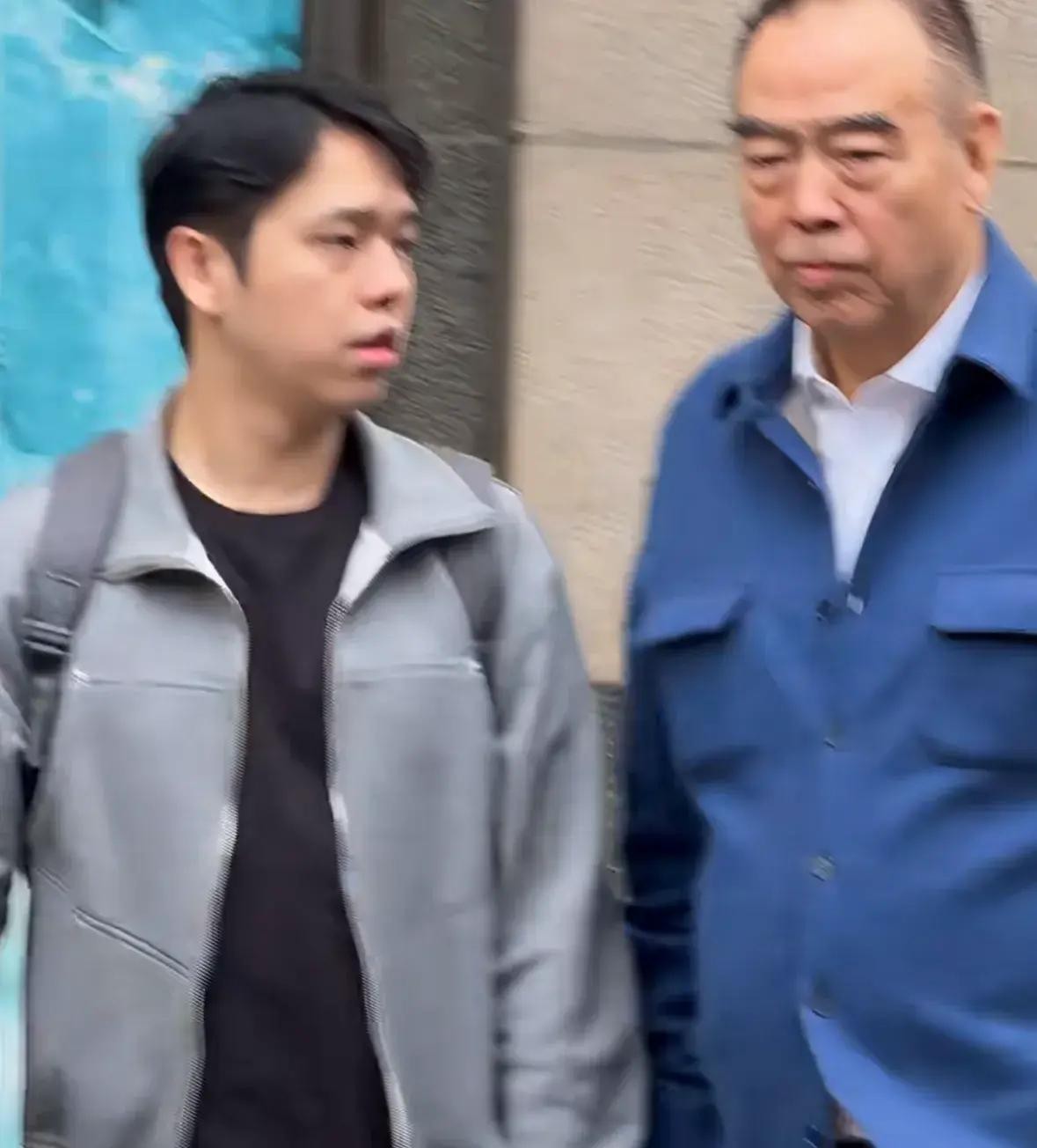 71岁的陈凯歌身着蓝色夹克搭配白衬衫,手持时尚手机壳,与大儿子陈雨昂肩并肩而行。