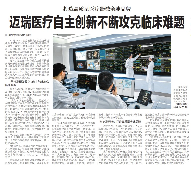 【深圳特区报】打造高质量医疗器械全球品牌 迈瑞医疗自主创新不断攻克临床难题