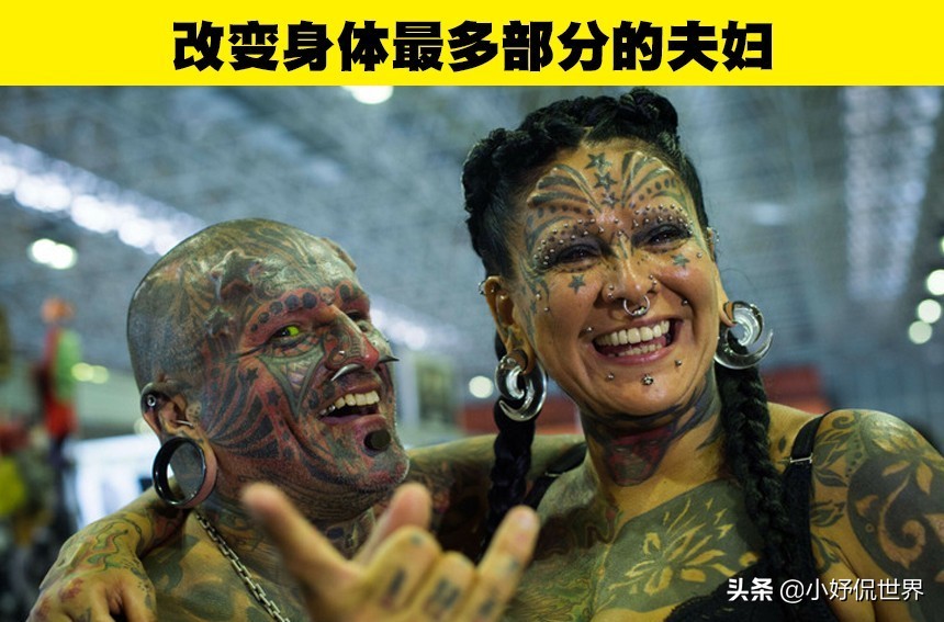很多时候,人们可能因为共同的爱好走在一起,甚至成为了夫妻。而加布里埃拉和维克多·佩拉尔塔就是这样一对夫妇。他们都非常热爱对身体进行纹身和穿孔等改造。他们的结合创造了一项吉尼斯世界纪录:世界上最多身体改造的夫妇。他们对身体的改变覆盖率达到了90%。