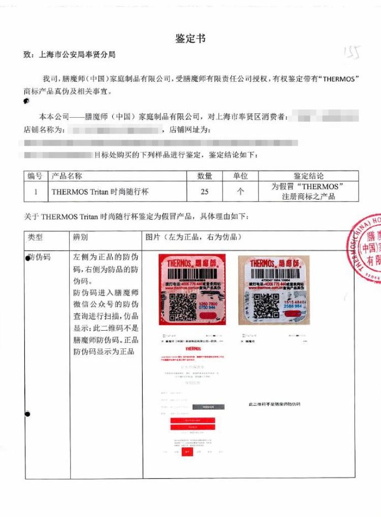 于是,他向该品牌中国子公司官方网站举报假货销售链接。经过商标持有人中国子公司膳魔师(中国)家庭制品有限公司鉴定,此款产品为假冒生产注册商标的产品,该网络店铺未获得品牌方的任何授权。