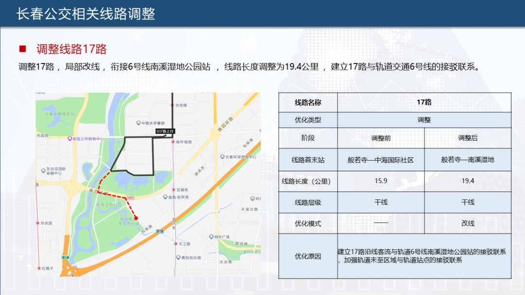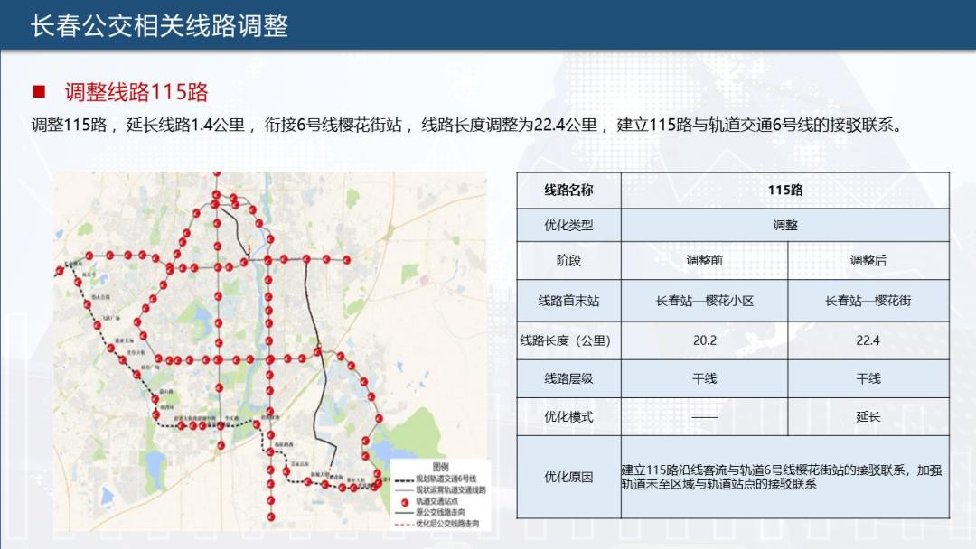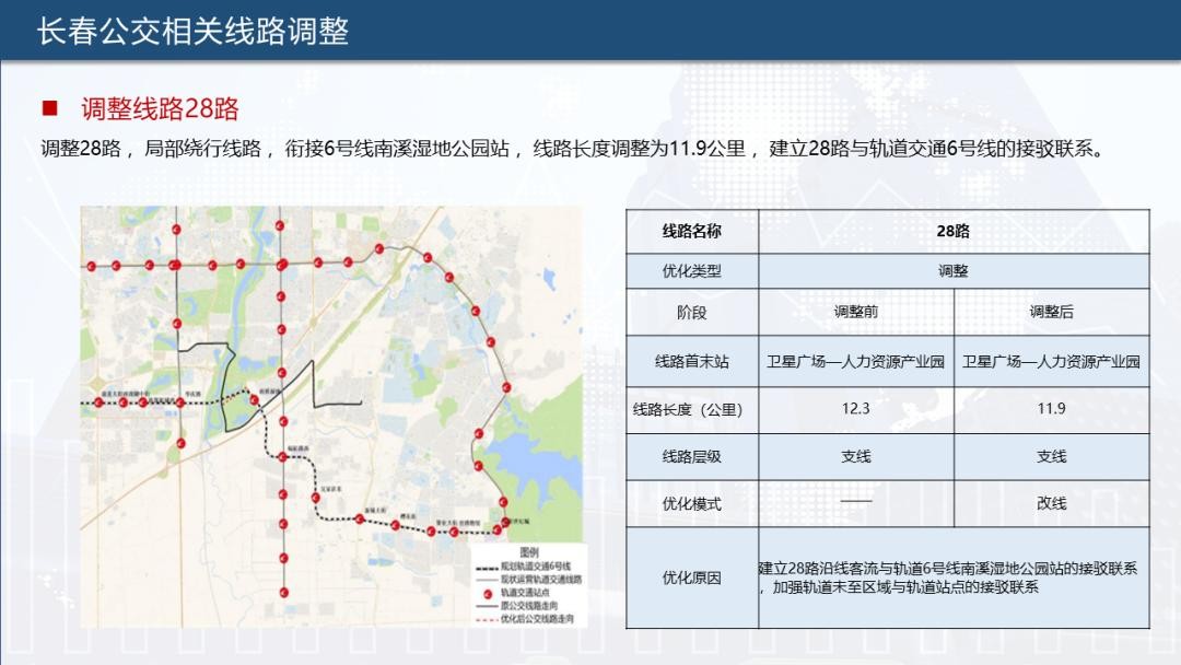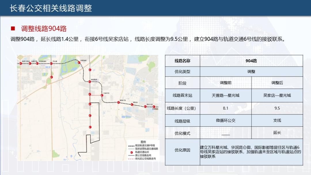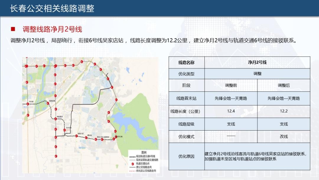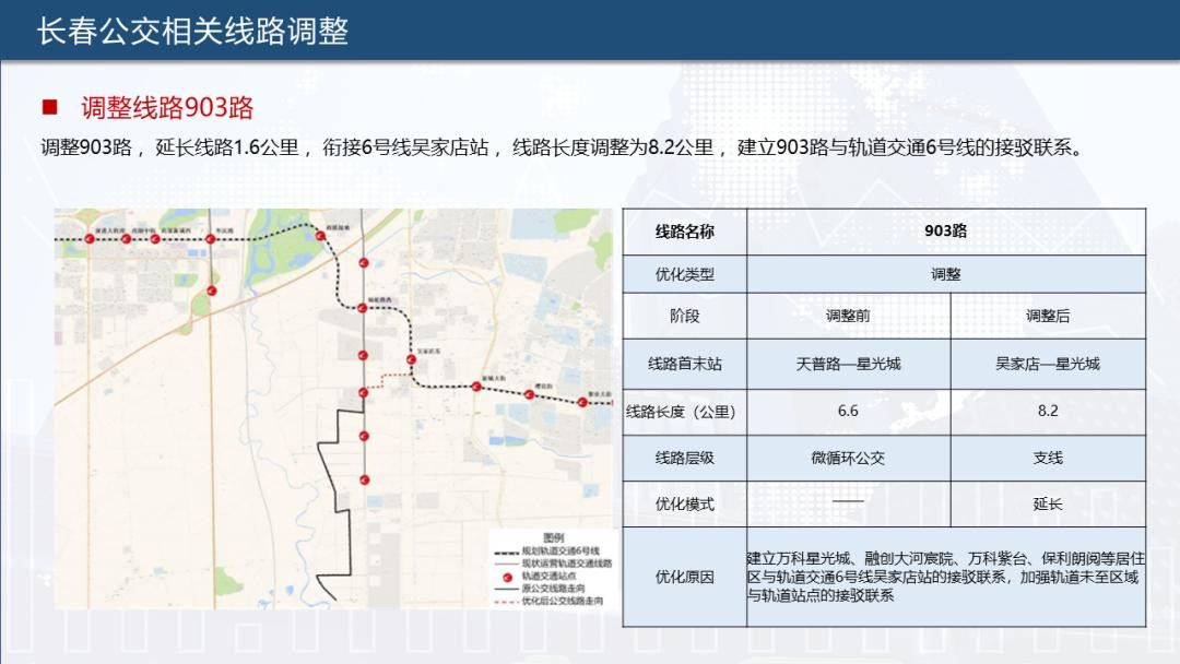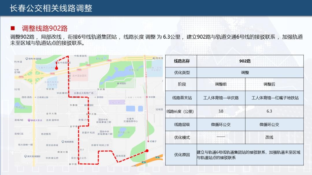 为实现公共交通“一张网”运行,提升公交、轨道接驳率,长春公交集团根据长春轨道交通6号线通车情况,对902路、903路、904路、115路、17路、231路、28路、69路、高新4号线、净月2号线、净月3号线合计11条公交线路进行优化调整,助力市民便捷出行。
