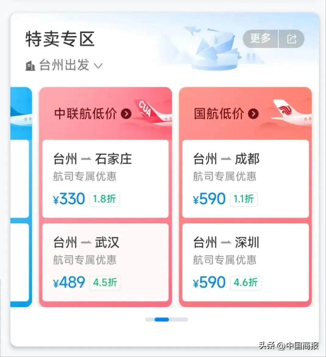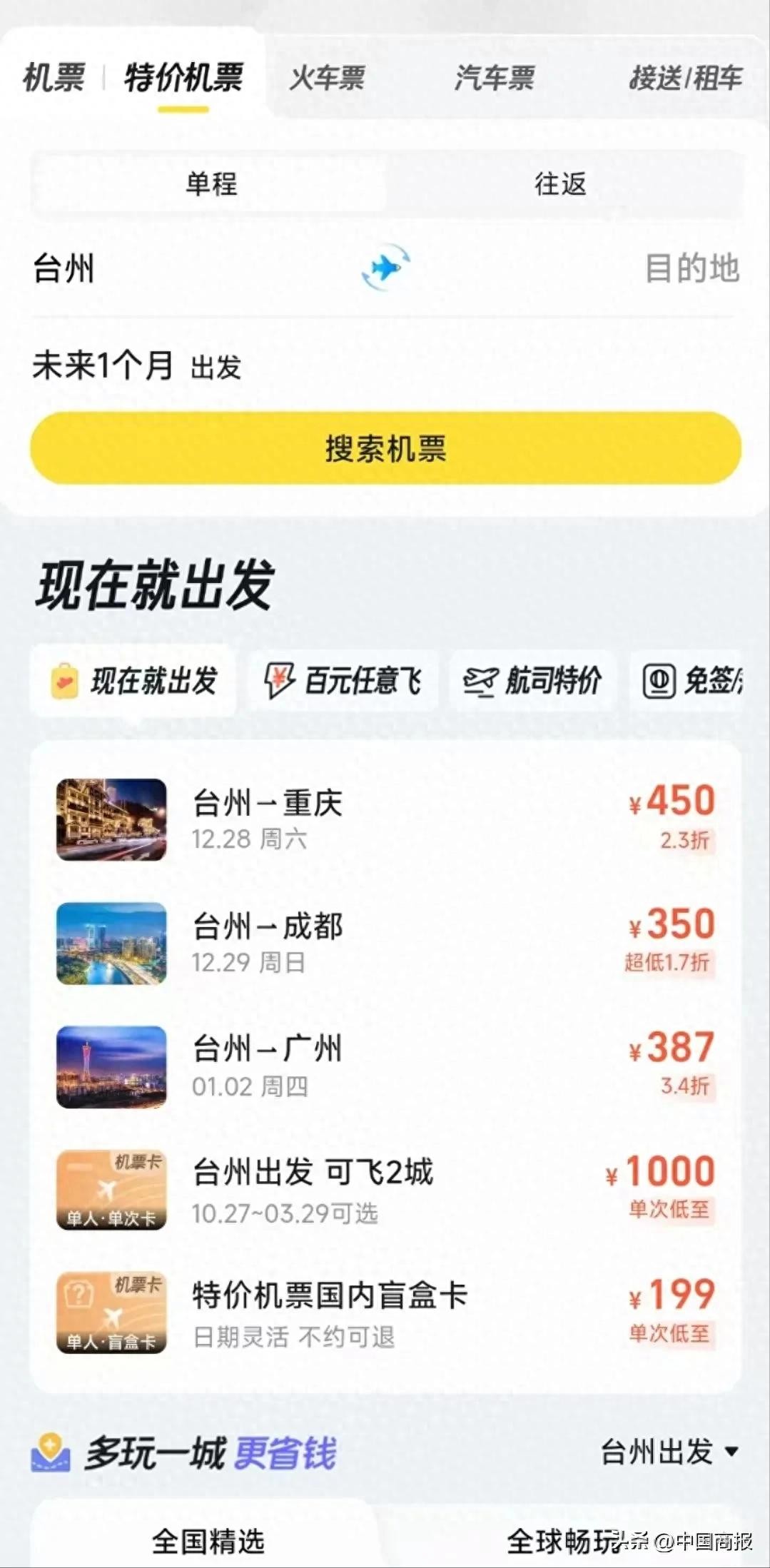 某旅行平台显示,近日从浙江台州出发,元旦前两天到广州、成都等热门旅游地机票最低价格均在300—400元,更有1.1折台州飞成都、1.8折台州飞石家庄的低价机票。
