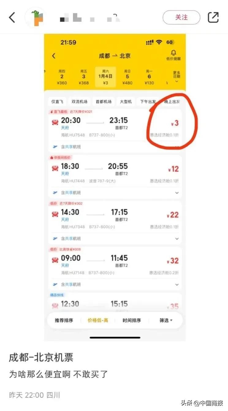 “成都到北京机票3块?打开真是眼睛揉了又揉,还能有这个价格的机票?”“成都—北京机票,为啥那么便宜啊?不敢买了。”“真有,因为我买了。”