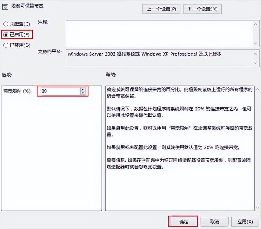 3、点击已启用,设置想要的带宽限制,点击确定按钮,如下图所示: