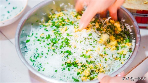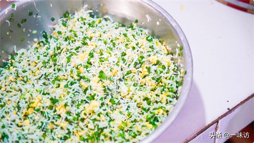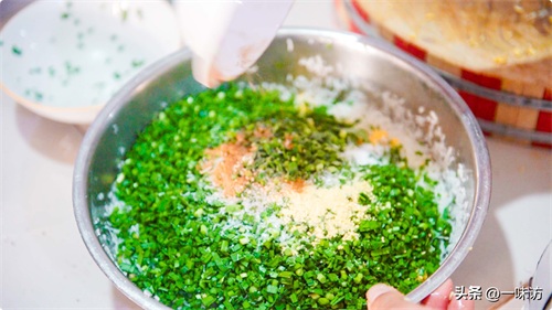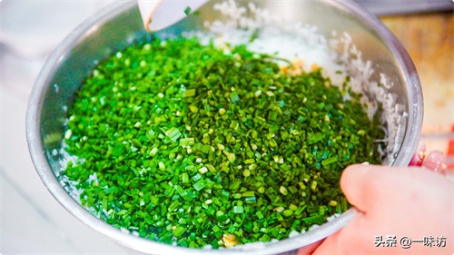 倒入少量的油搅拌,这样做是为了用油包裹住韭菜防止水分流失。