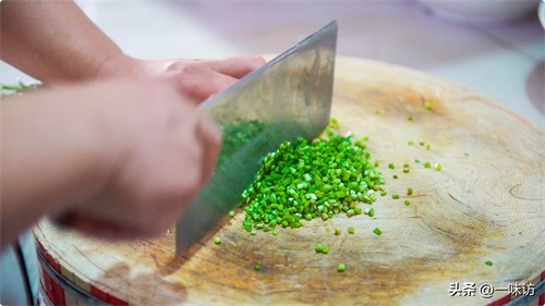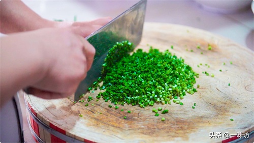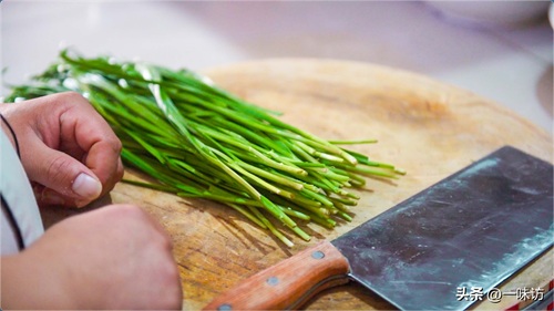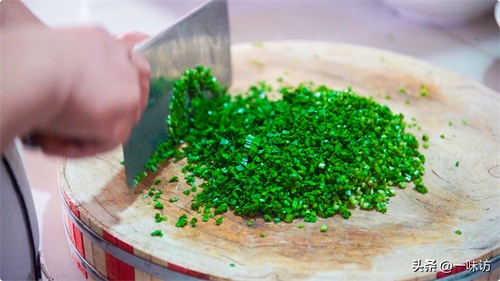 将韭菜捞出放在菜板上用刀切碎,然后放入一个盆中。